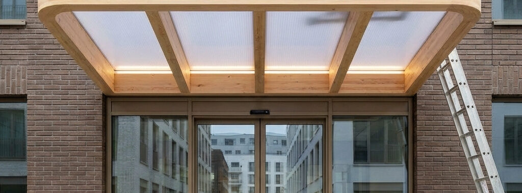 Op basis van de technische tekeningen is gekozen voor een maatwerk overkapping met een gebogen hoekafwerking. Deze afwerking voorkomt scherpe lijnen.