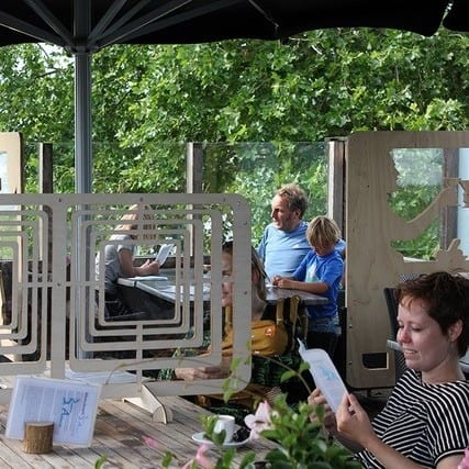 Als antwoord op deze vraag zijn deze luxe horecaschermen gemaakt. Deze hebben wij samen met ontwerpbureau Buzzard Design & Build laten ontwikkelen. In dit ontwerp zijn de plexiglas platen verwerkt in uitgefreesd materiaal. Het scherm is op diverse plekken vastgemaakt aan het hout, zodat er een stevig geheel ontstaat. De luxe schermen hebben houten poten.