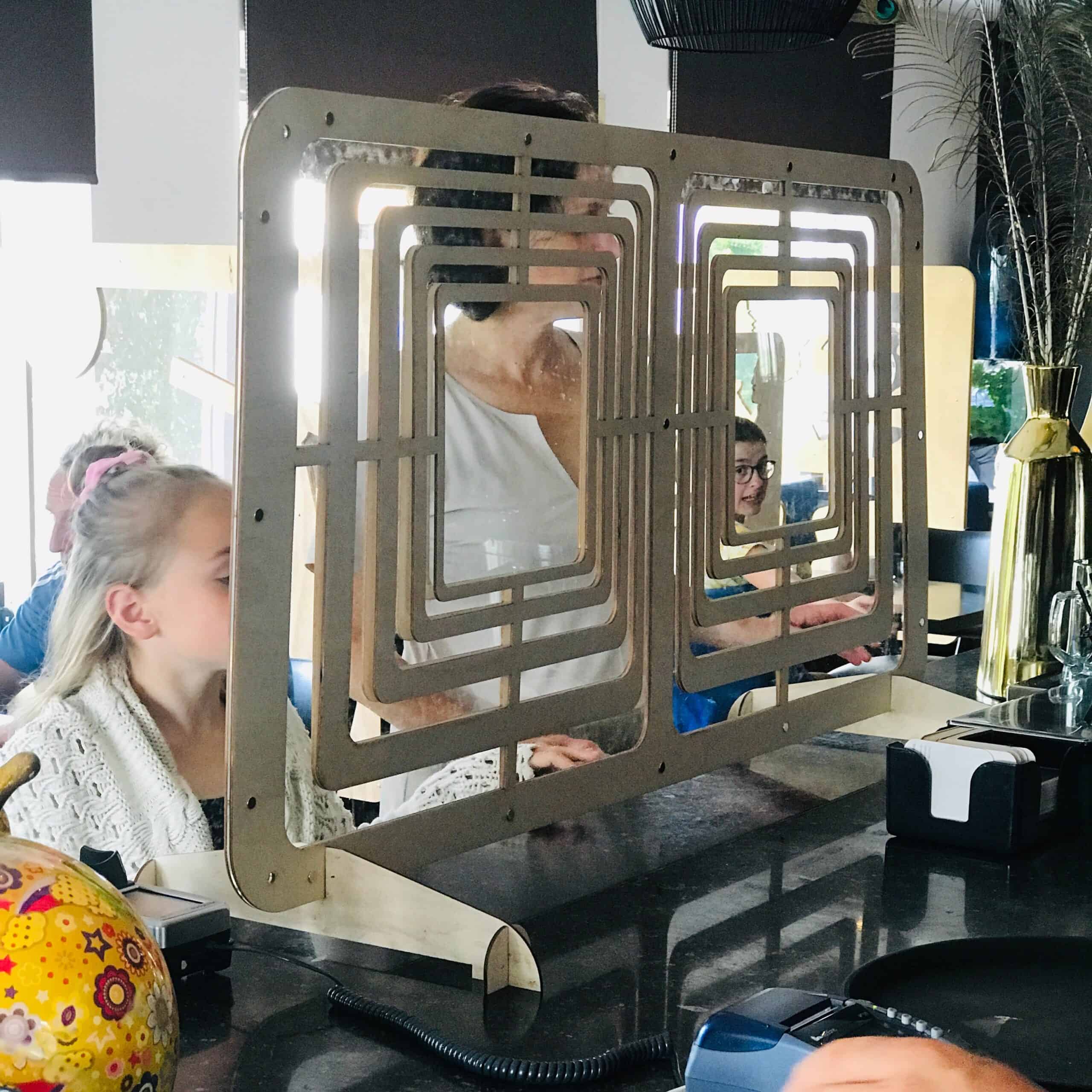 Dit unieke scherm hebben wij samen met ontwerpbureau Buzzard Design & Build gerealiseerd. Het abstracte design van dit scherm heeft een moderne look en is dus echt een toevoeging aan uw interieur, maar biedt ook de nodige bescherming tegen COVID-19!
