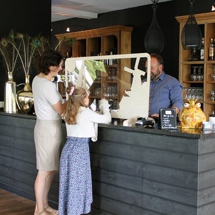 Het Hollandse design van dit plexiglas coronascherm in combinatie met de houten afwerking maken het kuchscherm decoratief maar praktisch tegelijk. Een ideaal kuchscherm dus voor de horeca ondernemer die zijn gasten optimaal wil beschermen tegen corona!