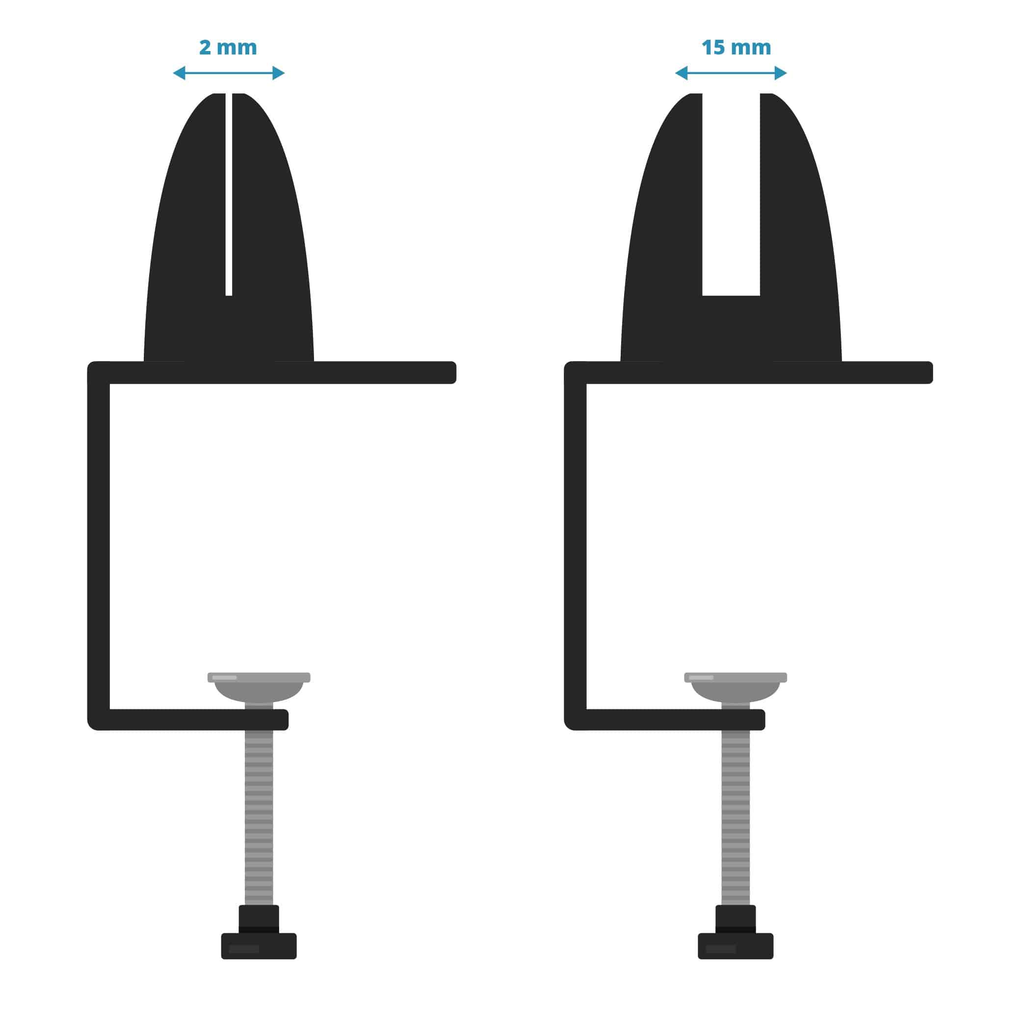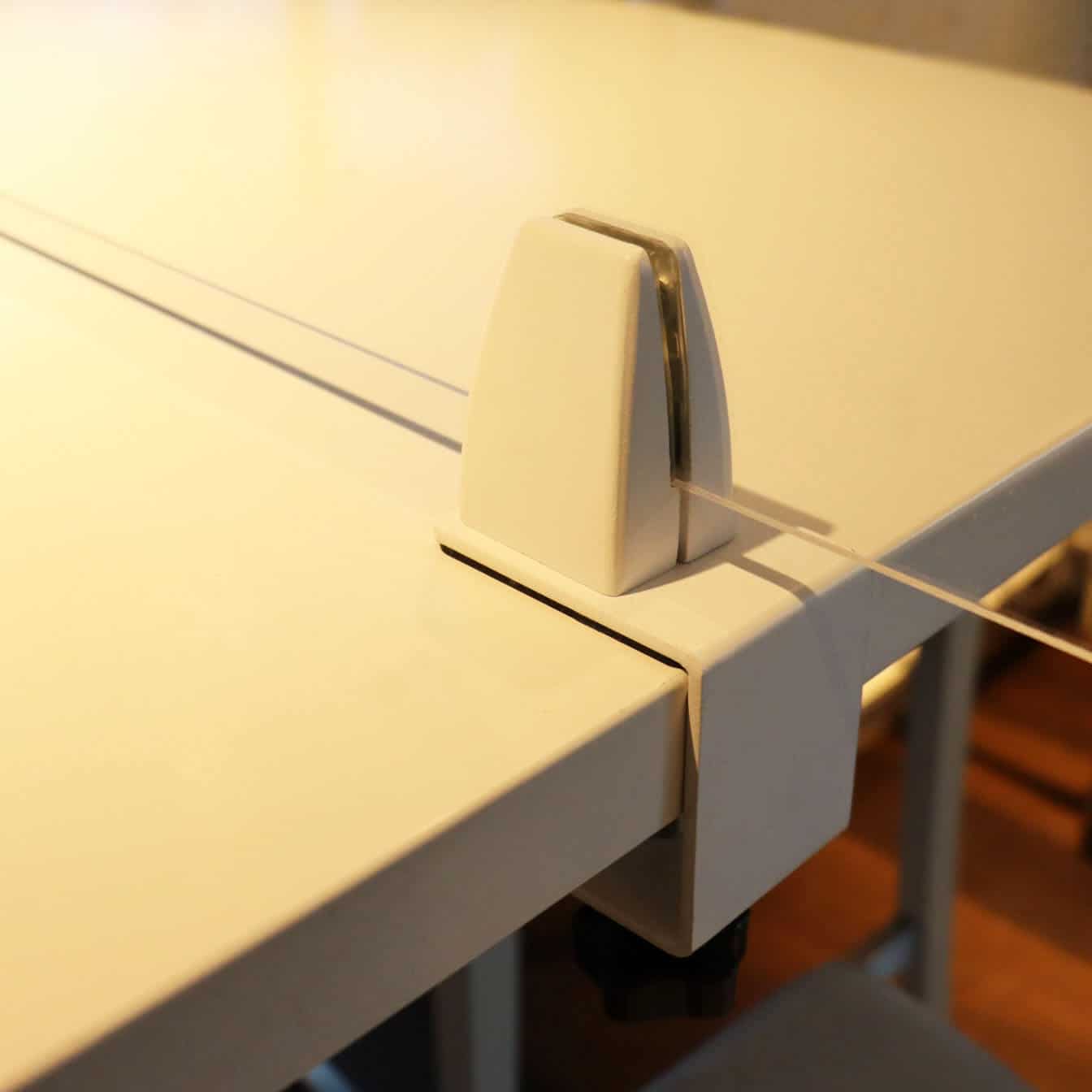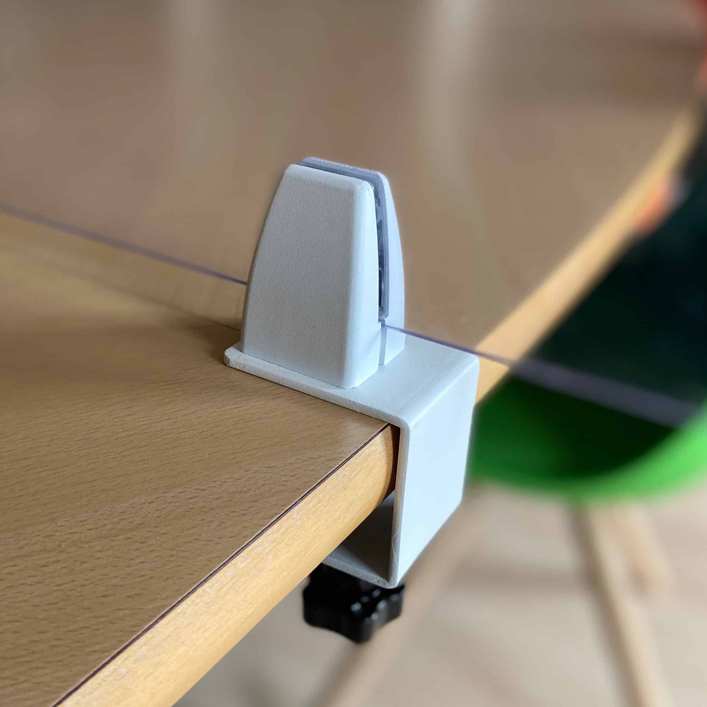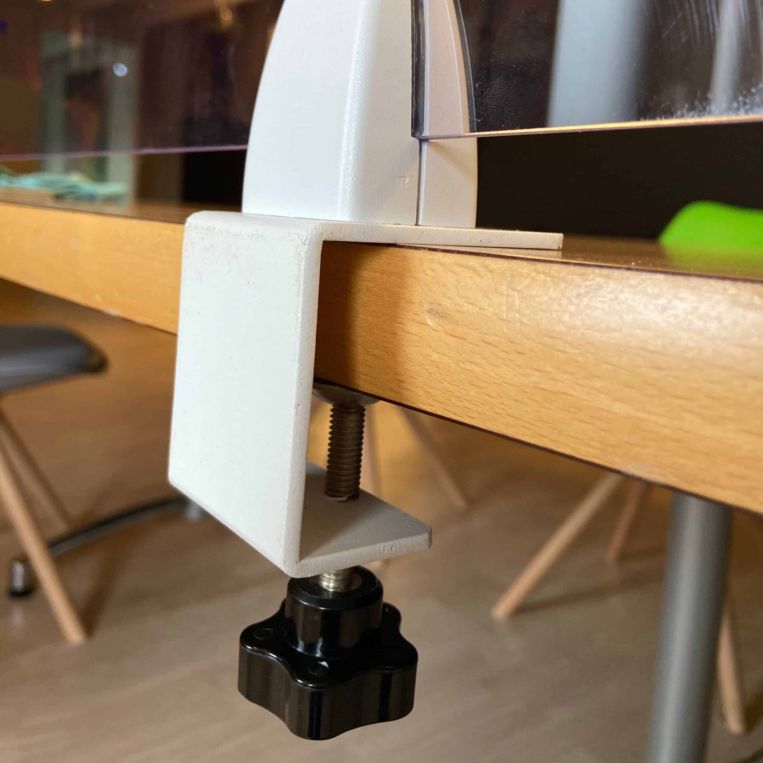 U ontvangt bij de levering van de kuchschermen degelijke stalen klemmen, welke speciaal hiervoor ontwikkeld zijn. Hierbij kunt u kiezen uit zwarte of witte klemmen. Het woord zegt het al: u ‘klemt’ het kuchscherm hiermee aan het bureau, de balie of de tafel. Dit doet u door de klem op de tafel te plaatsen en de knopschroef vast te draaien. Vervolgens plaatst u het kuchscherm in de klem en draait u ook deze aan, met een schroevendraaier.