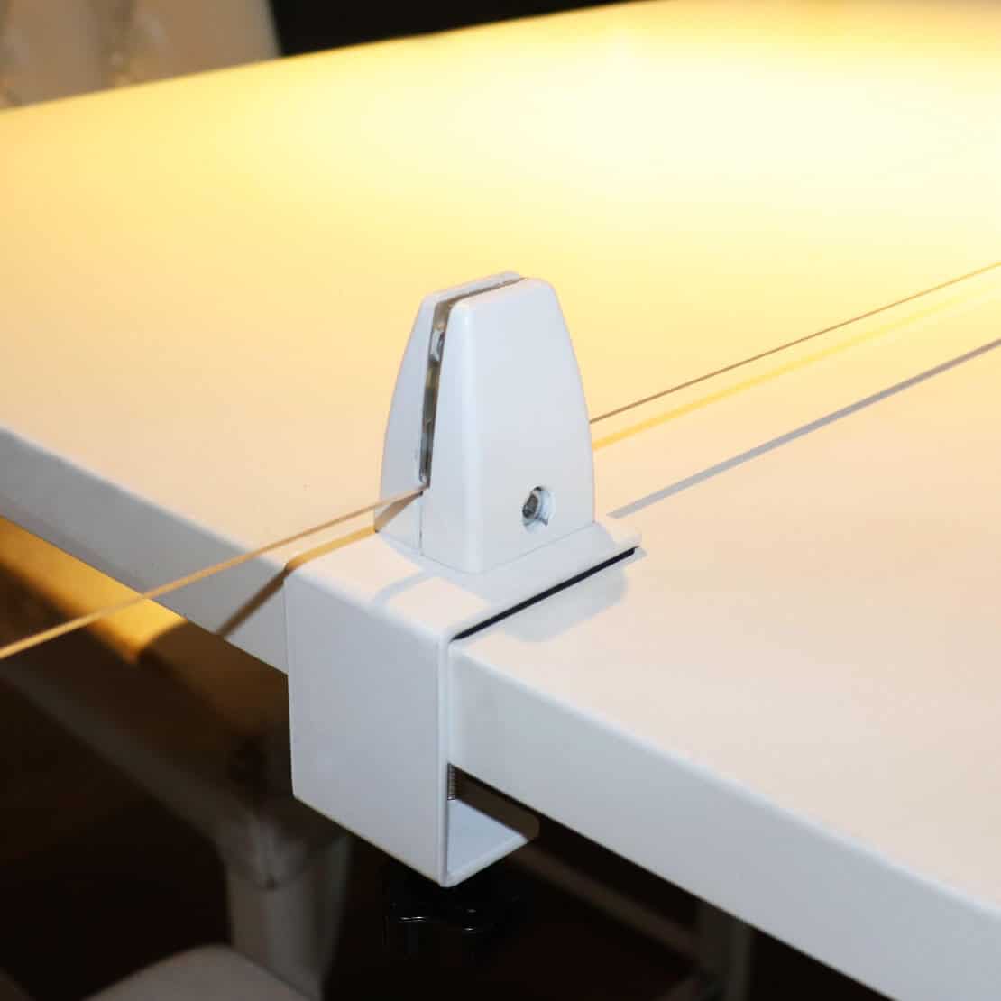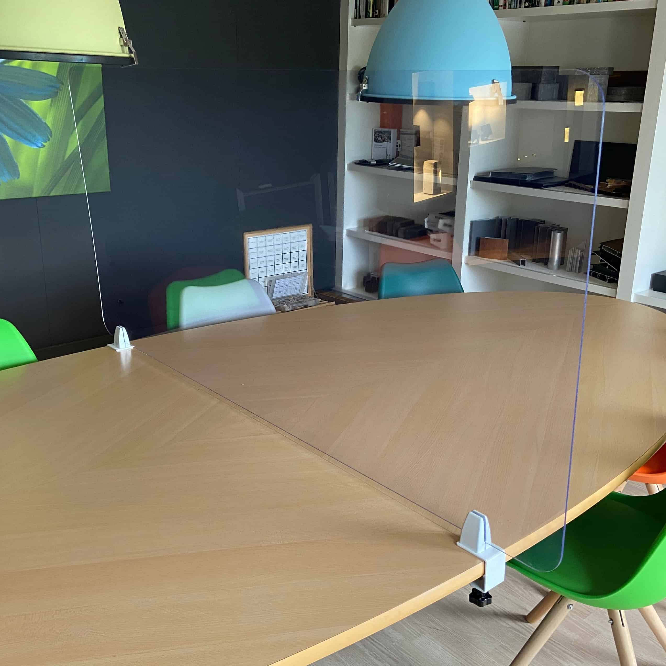 Multifunctioneel, bruikbaar als bv. baliescherm, horecascherm of kantoorscherm tegen verspreiding van virussen. Kies de afmetingen, de vormgeving en de kleur van de klemmen. Het bovenste deel van de klemmen is draaibaar. U kunt het scherm hierdoor ook haaks in het midden van een tafel plaatsen.