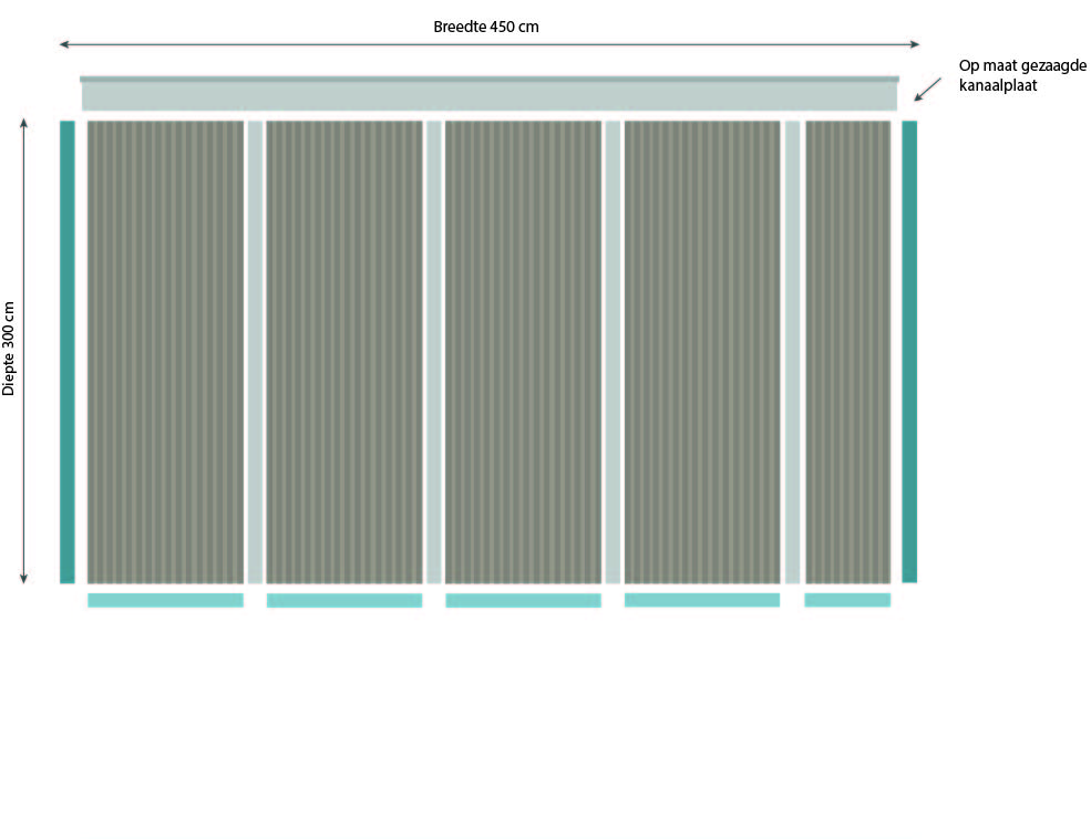 Goed om te weten: de breedte van de platen wordt niet evenredig over de volledige overkapping-breedte verdeeld i.v.m. snijverlies. Bij bijvoorbeeld een dak van 334 cm breedte krijg je 3 platen van 98 cm en 1 van 32 cm. Voor een meerprijs kunnen we alle platen even breed leveren. Doe hiervoor een offerte-aanvraag.