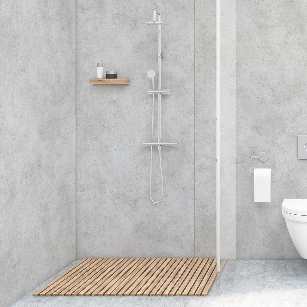 Grijs PVC paneel met betonlook. Makkelijk te verlijmen over bestaand tegelwerk. 100% waterproof. Vraag een offerte aan voor bewerkingen.